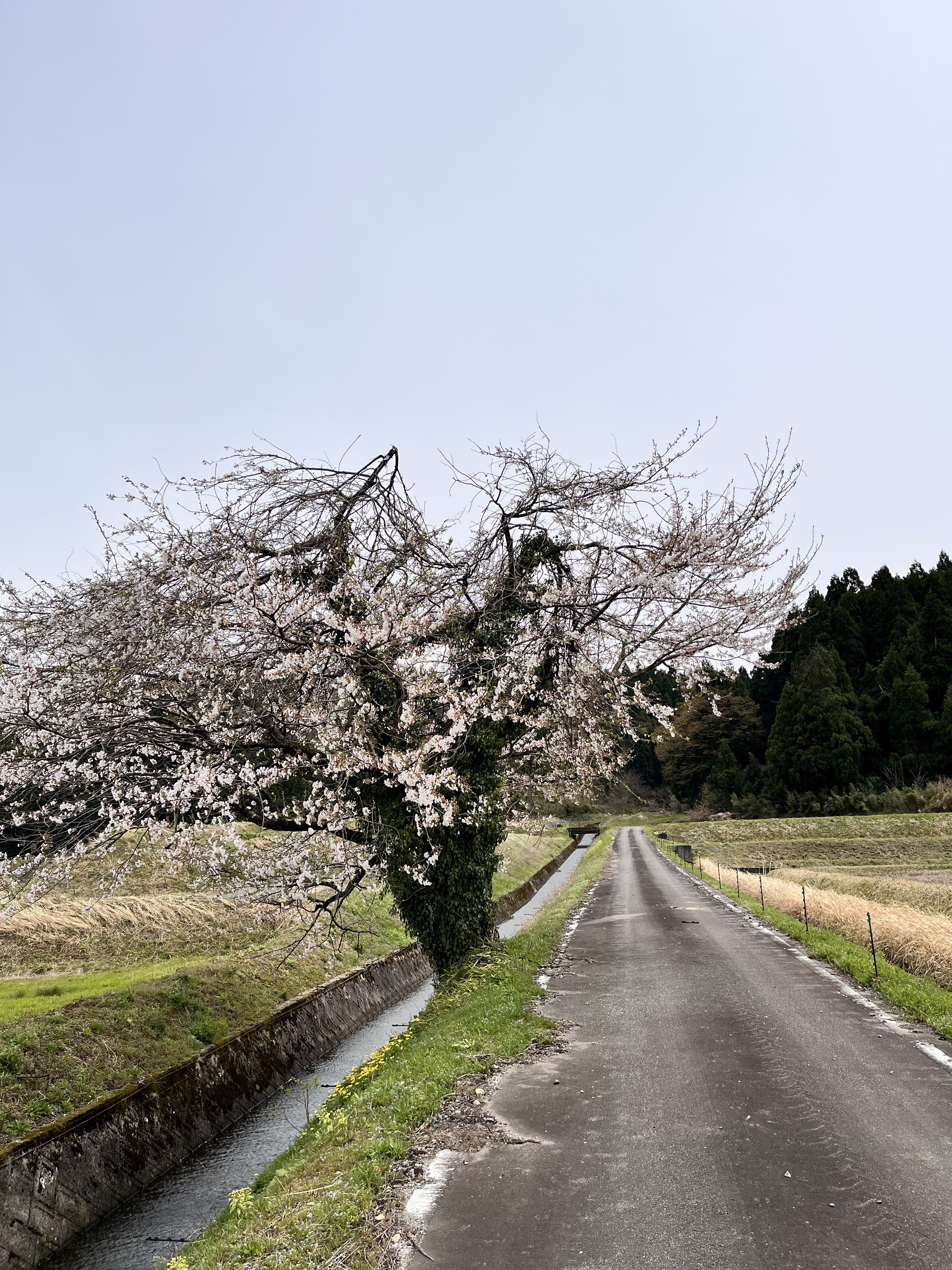 先日大きな風が吹いて空き家が崩壊してたり、木が折れてたり。春の嵐、本当困る。この桜もたぶんあの嵐の日に枝が折れたんだと思う。田んぼのところの桜の木。